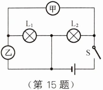 15. 如图所示的电路中,闭合开关 S 后,两灯都正常发光,两电表指针都有偏转,示数稳定。已知电源电压为 8 V,灯 $ L_{1} $ 的电阻为 16 Ω,灯 $ L_{2} $ 的电阻为 12 Ω,则甲电表的示数为