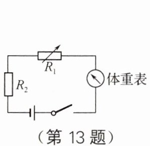 13. 如图所示是电子体重秤原理图,$ R_{1} $ 为压敏电阻,其阻值随人体质量的增大而减小,$ R_{2} $ 为定值电阻。体重表相当于一个