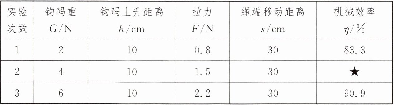 |实验次数|钩码重$G/N$|钩码上升距离$h/cm$|拉力$F/N$|绳端移动距离$s/cm$|机械效率$\eta/\%$|