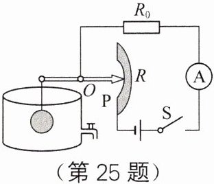 25. (12 分)如图所示是一种测定油箱内油量的装置。竖直放置的均匀圆弧形电阻丝 R 长 20 cm,规格为 1 Ω/cm。滑片 P 与滑杆连接,滑杆可绕固定轴 O 转动,O 是滑杆的中点,且与电阻丝 R 的中点在同一高度,滑杆的另一端通过轻质细杆连接一个浮子。油箱中的油量减少时,浮子随油面一起下降,带动滑杆使滑片向上移动,电流表的示数始终随之改变。
