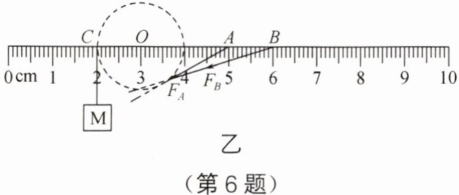 (2)如图乙所示,可绕O点转动的杠杆(质量忽略不计,g取10N/kg),在C点挂上质量是5kg的物体M,先后在A点向圆切线(与圆只有一个交点)方向拉$ F_{A} $,向圆割线(与圆有两个交点)方向拉$ F_{B} $,两次都使杠杆水平平衡。