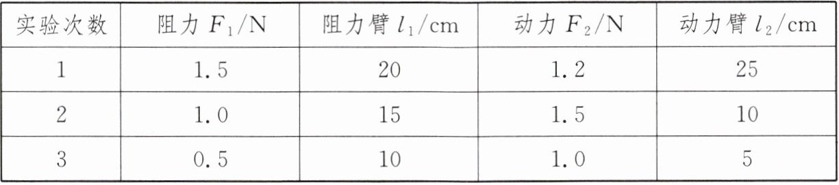 (用公式表示)。|实验次数|阻力$ F_{1}/N $|阻力臂$ l_{1}/cm $|动力$ F_{2}/N $|动力臂$ l_{2}/cm $|