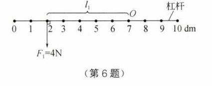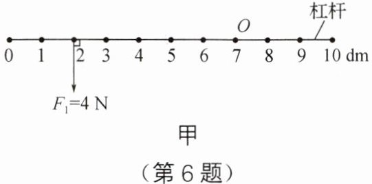 (1)如图甲所示,在O为支点的轻质杠杆上施加一个竖直向下大小为4N的力$ F_{1} $,为使杠杆能保持水平静止,杠杆同时受到另一个沿竖直方向的力(图中未画出)。