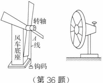 36. 风车是利用风力做功的装置。小明带领物理兴趣小组同学制作了一架小风车,想粗略测定风车在一定风速下做功的功率,利用如图实验装置进行实验: