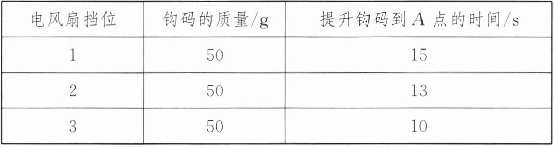 |电风扇挡位|钩码的质量$/g$|提升钩码到$A点的时间/s$|