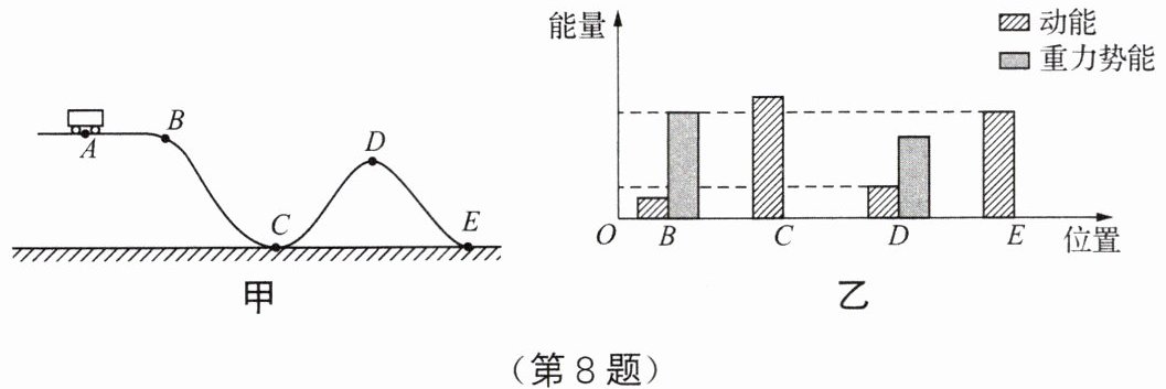 8. 如图甲所示,过山车从A点出发,先后经过B、C、D、E点。如图乙所示是过山车在B、C、D、E点的动能和重力势能大小的示意图,则过山车的动能在