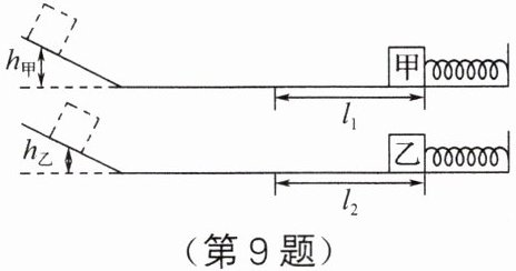 9. 用甲、乙两个木块将相同弹簧压缩到图示位置后由静止释放,沿光滑水平轨道滑行,可冲到光滑斜面上。若木块能到达斜面的最大高度$ h_{甲}>h_{乙} $,弹簧的压缩量$ l_{1}= l_{2} $,则甲、乙离开弹簧时的动能$ E_{甲} $
