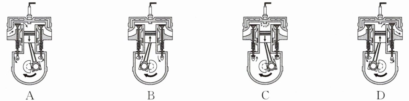 13. 自行车急刹时,轮胎与地面摩擦,温度会升高,下列四冲程汽油机的四个冲程中,与轮胎升温过程能量转化相似的是(
