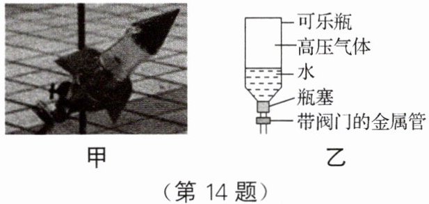 14. 某校的科技活动周举办了一场水火箭发射比赛。图甲所示是小明用可乐瓶制作的水火箭,图乙所示是水火箭的示意图。小明先在瓶里装适量水,然后将带有阀门的金属管插入瓶塞,旋紧瓶塞后用打气筒往瓶里打足气;打开阀门后,水从尾部的金属管向下喷出,水火箭随即飞向空中。下列分析正确的是(