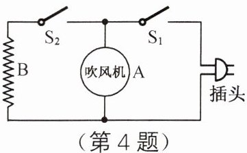 4. 如图所示是一把既能吹冷风又能吹热风的电吹风简化电路图,图中 $ A $ 是吹风机,$ B $ 是电热丝。将插头插入插座,当开关 $ S_1 $、$ S_2 $ 同时闭合,电吹风吹出的是