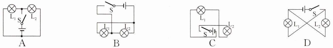 5. 如图所示,下列电路中,开关 $ S $ 闭合时,$ L_1 $、$ L_2 $ 两灯串联的是(