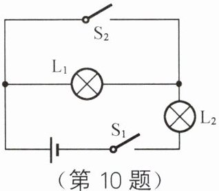10. 在如图所示的电路中,当开关 $ S_1 $、$ S_2 $ 都闭合时,亮着的灯是