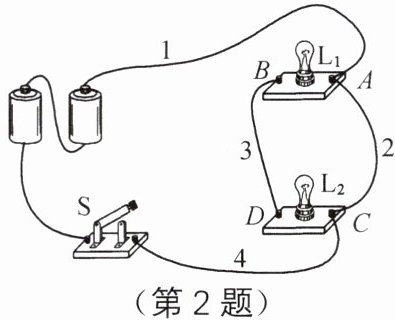 ;要使灯泡$L_1、$$L_2$并联,则应将导线4接C接线柱的一端改接D接线柱(或将导线1接A接线柱的一端改接B)