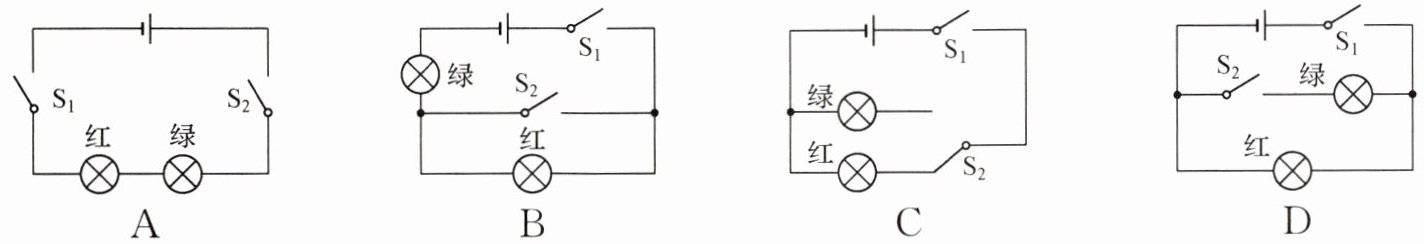 8. 下列电路中,符合直行方向交通信号灯(只考虑红灯和绿灯)模拟设计的是 (