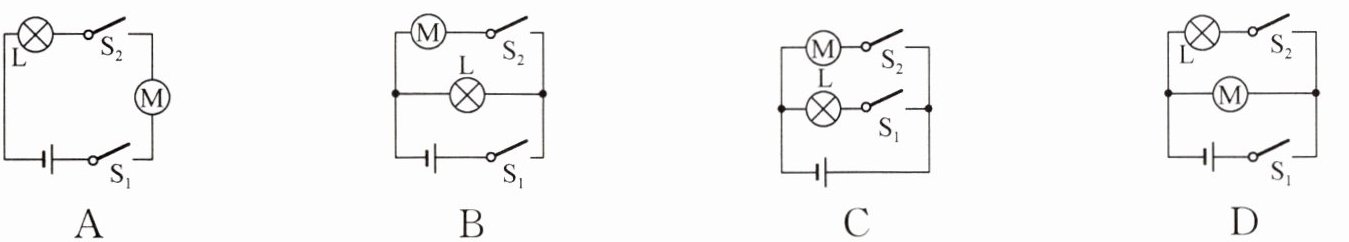 7. 某校科创小组为“共享助力车”的安全头盔设计以下方案:扫码成功后开关$S_1$闭合,指示灯L亮;从车头取出头盔并戴上后,头盔内遥控设备遥控$S_2$闭合,电动机通电工作;扫码且戴头盔才能骑行。下列电路符合以上设计要求的是 (