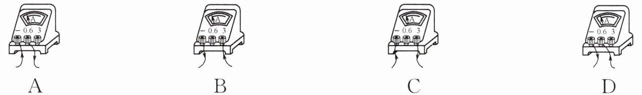 13. 小红用电流表测量某电路中的电流,若电流的大小约为$0.5\mathrm{A}$,则下列选项中选用的接线柱及通过接线柱的电流方向正确的是(