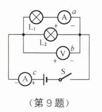 9. 在如图所示的“〇”内填电流表或电压表的符号,并标明电表的正、负接线柱。