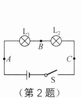 2. 小亮将灯泡 $ L_1 $、$ L_2 $ 串联在电路中,如图所示,闭合开关 $ S $,他发现灯泡 $ L_1 $ 比 $ L_2 $ 更亮。他猜想可能是由于通过 $ L_1 $ 的电流比通过 $ L_2 $ 的电流大。为验证猜想,小亮进行了下面实验:他用电流表分别测量图中 $ A $、$ B $、$ C $ 三点的电流,电流表的示数均相同。由此说明:他的猜想是