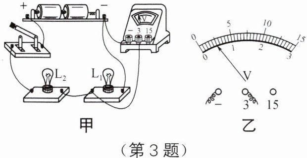 3. 如图甲所示,电路中的电压表测的是灯