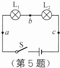 5. 如图所示,在“探究串联电路中各处电流的关系”实验中,某同学用电流表分别测出 $ a $、$ b $、$ c $ 三处的电流大小,并初步得到它们之间关系的结论。为了进一步探究它们之间的关系,下一步他的操作是(
