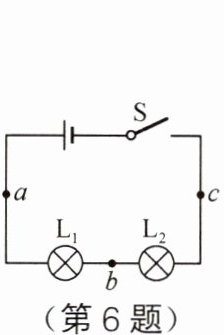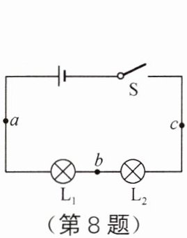 8. 在探究串联电路的电流特点的实验中,小明同学选用两个不同的小灯泡组成了如图所示的串联电路,然后用同一个电流表分别接在 $ a $、$ b $、$ c $ 三处测量电流。其中一次实验的测量数据如下表,在分析数据时,发现三处的测量值有差异。下列说法正确的是(