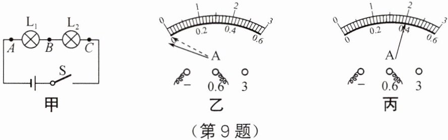 9. 小明在探究“串联电路中各处电流的关系”实验时,设计实验电路图如图甲所示。