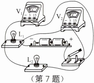7. 如图所示,当闭合开关后,电压表$\textcircled{V_1}$、$\textcircled{V_2}$的示数分别是 $ 1 \, V $ 和 $ 3 \, V $,则小灯泡 $ L_1 $ 和 $ L_2 $ 两端的电压分别为(