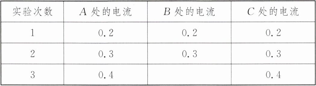 | 实验次数 | $ A $ 处的电流 | $ B $ 处的电流 | $ C $ 处的电流 |