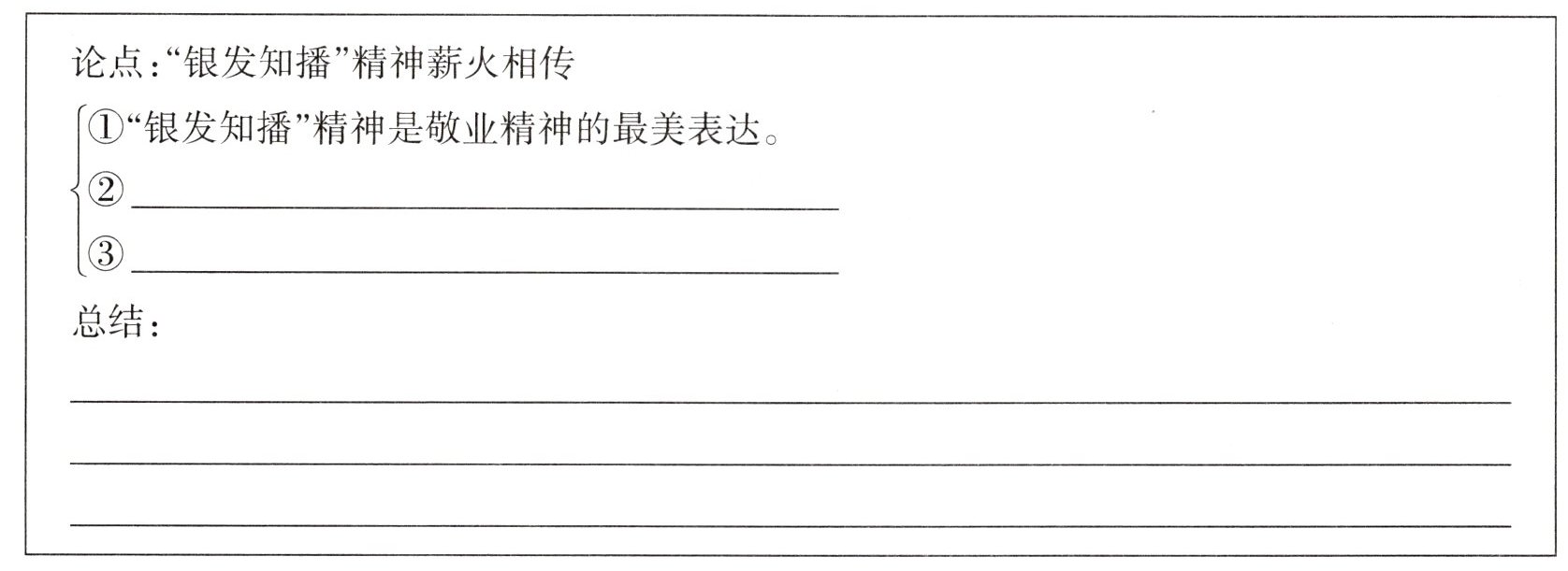 ②“银发知播”精神是奉献精神的绝佳体现。 ③“银发知播”精神是执着精神的有力诠释。 总结:青松不老,夕阳倍红。我们要传承“银发知播”精神,从自身做起,敬业乐群,努力奋斗,乐于奉献,勇于承担起新时代赋予青年的历史使命,为实现中华民族的伟大复兴提供源源不断的精神动力。