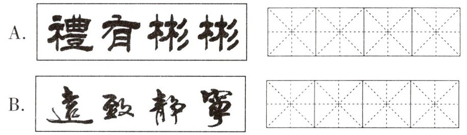 1. 请标出下面书法作品的书体,并用简化楷体,按现代汉语书写顺序正确、工整、规范地抄写在米字格中。