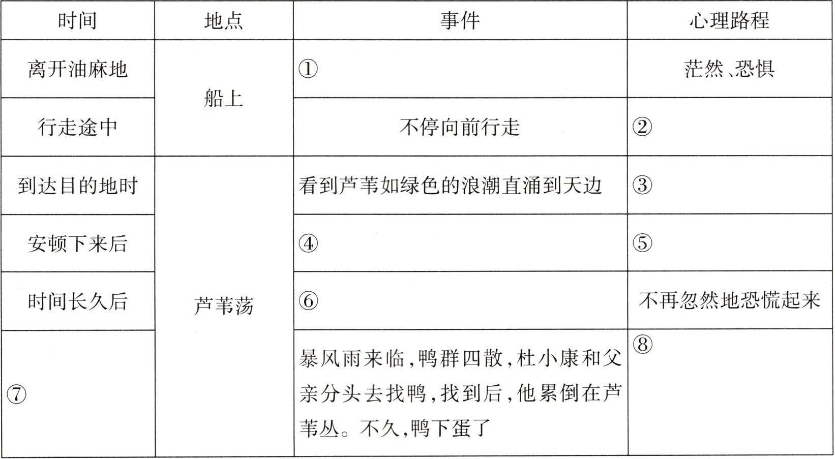 5. 小明在自读课文时做了一张学习卡,他请你一起梳理情节,理解杜小康的心理路程,体会他走向成熟的成长之路。