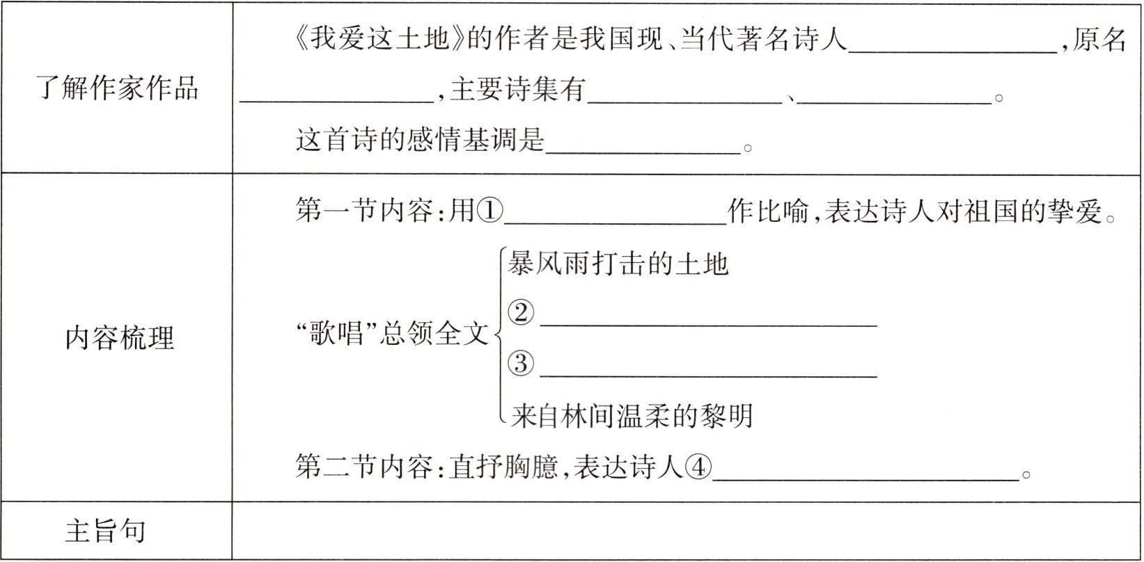 艾青 蒋正涵 《大堰河——我的保姆》《光的赞歌》 忧郁、悲愤 ①一只鸟儿生死眷恋土地 ②汹涌着悲愤的河流 ③无止息地吹刮着的激怒的风 ④真挚、炽热的爱国之心 为什么我的眼里常含泪水?因为我对这土地爱得深沉……