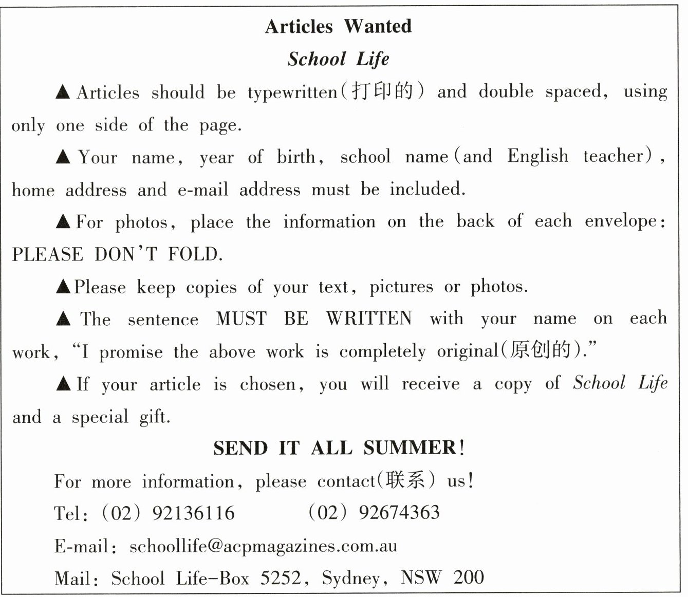 )43. According to the passage, you can send your articles ______.A. within 3 weeks B. all summer C. all the year round
