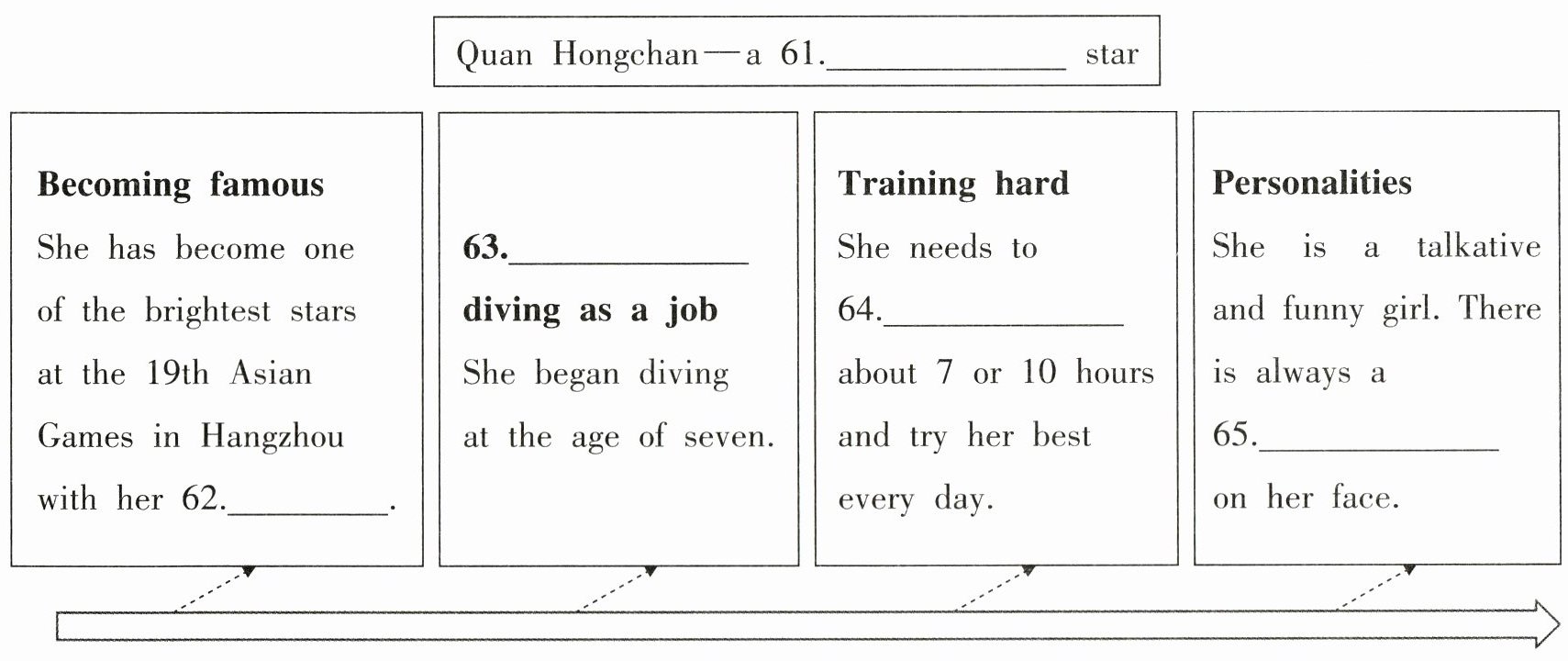 68. I think she is a hard-working and successful girl. Because she keeps training and tries her best every day to become an excellent diver.(答案不唯一)