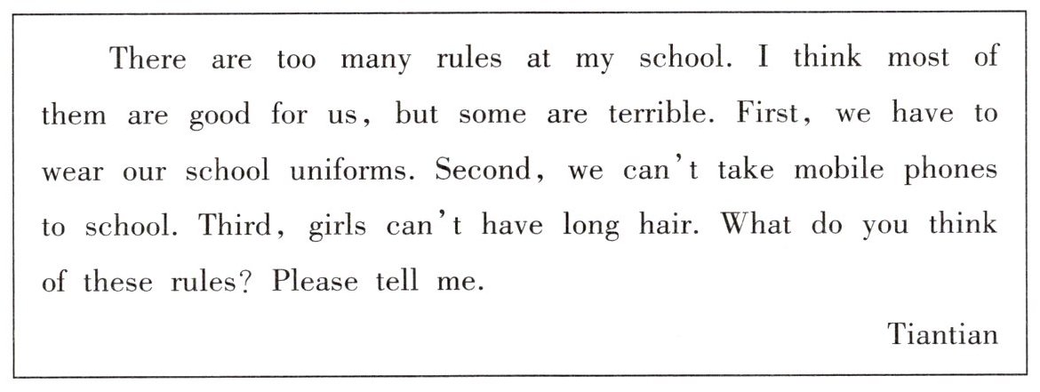 Hi, Tiantian. Let me tell you what I think of the three school rules. I think it's necessary for us students to wear school uniforms at school. If so, we don't have to spend time choosing what to wear. That will save us a lot of time. We're not allowed to take mobile phones to school, either. I hate that rule. We can call our parents or friends easily if we have our own phones. When we meet new English words, we can also use our mobile phones to look them up. I think we should be allowed to take them to school as long as we promise not to use them in class. As for the third rule, I think it's strange and unfair to girls. I can't stand it, either.