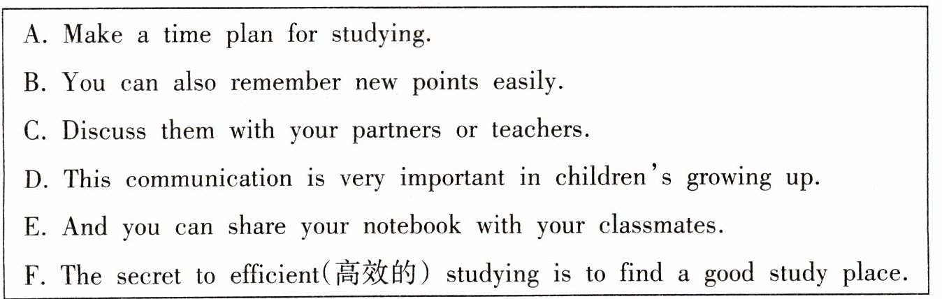 Having good habits can make you study better. When you have good habits, you can learn things quickly. 1.______ So it is necessary for you to develop some good studying habits. But how can you do it? Here are some suggestions for you.
