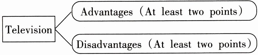 英语课堂上,同学们在探讨现代发明给生活带来的方便。电视是一项伟大的发明,它给我们的生活增添了乐趣。请根据下面思维导图所给信息,写一篇介绍电视的短文,100词左右。
