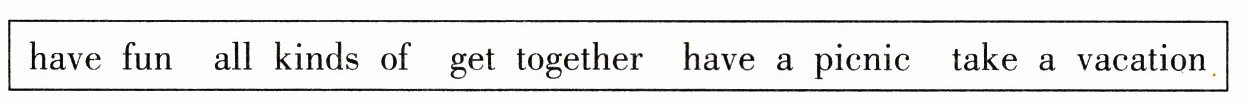 1. get together 2. all kinds of 3. to take a vacation 4. having fun 5. had a picnic