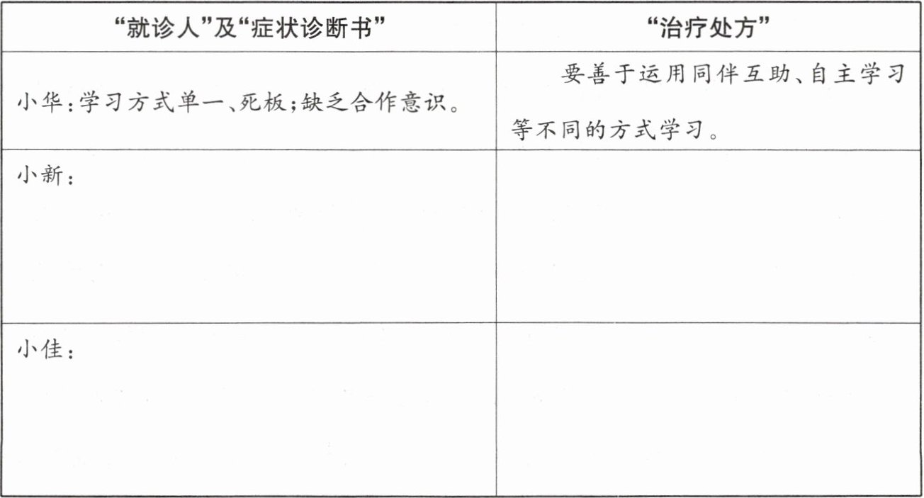 |小华:学习方式单一、死板;缺乏合作意识。|要善于运用同伴互助、自主学习等不同的方式学习。|