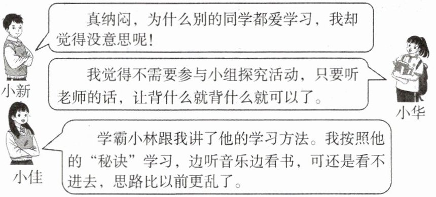 |小新:真纳闷,为什么别的同学都爱学习,我却觉得没意思呢!|小华:我觉得不需要参与小组探究活动,只要听老师的话,让背什么就背什么就可以了。|