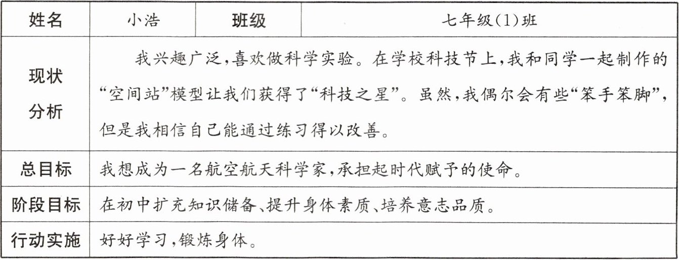 (2)示例:凡事预则立,不预则废。小浩同学有明确的规划意识。从具体内容看,小浩同学能够在认识自己的基础上,紧扣时代脉搏,结合兴趣、性格、能力等自身条件以及社会需要,确定个人发展目标,并从长远目标和近期目标进行规划,以上都是这份行动计划书中值得称赞的地方。但制订行动方案还需要明确实施细节,列出时间表。这份行动计划书中的行动实施部分还需要进一步完善,明确什么时间完成什么事情,使行动方案切实可行。期待小浩同学积极调整,制订更加合理的规划,持之以恒,更好地度过初中生活。