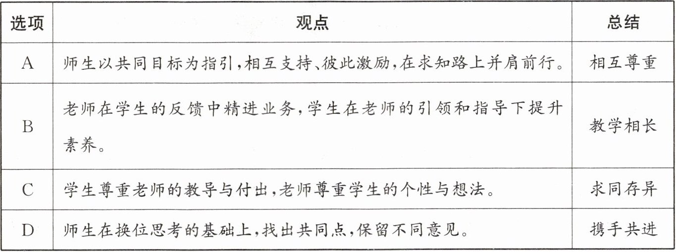 |D|师生在换位思考的基础上,找出共同点,保留不同意见。|携手共进|