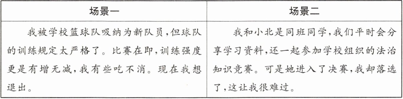 | 我被学校篮球队吸纳为新队员,但球队的训练规定太严格了。比赛在即,训练强度更是有增无减,我有些吃不消。现在我想退出。 | 我和小北是同班同学,我们平时会分享学习资料,还一起参加学校组织的法治知识竞赛。可是她进入了决赛,我却落选了,这让我很难过。 |