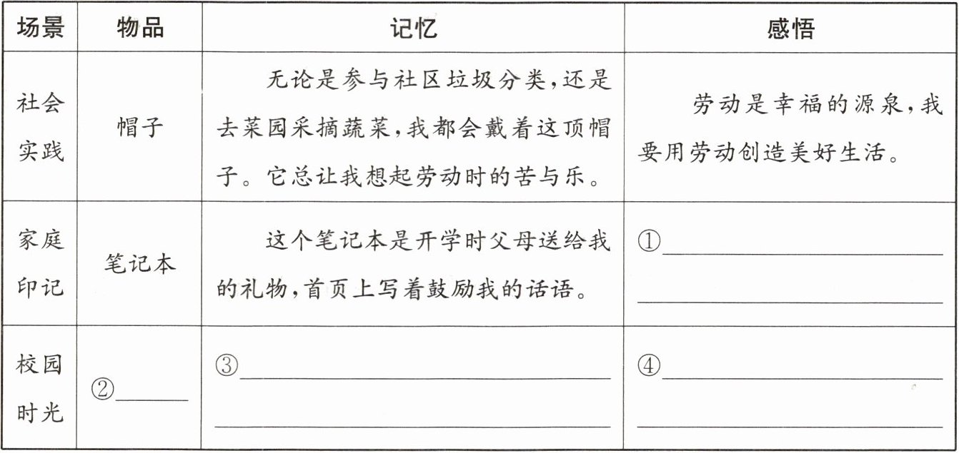 |家庭印记|笔记本|这个笔记本是开学时父母送给我的礼物,首页上写着鼓励我的话语。|①______|