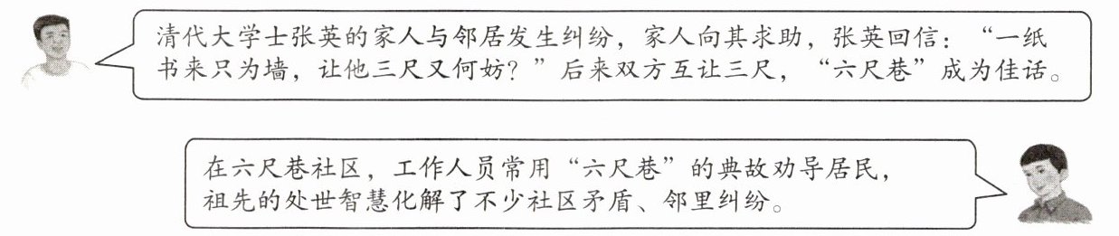 |清代大学士张英的家人与邻居发生纠纷,家人向其求助,张英回信:“一纸书来只为墙,让他三尺又何妨?”后来双方互让三尺,“六尺巷”成为佳话。|