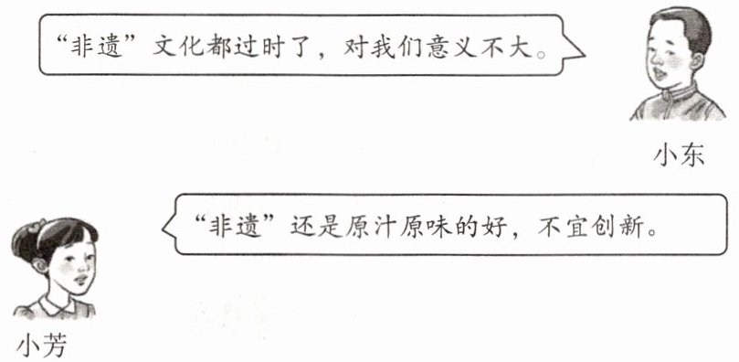 某校启动了“‘非遗’文化月”活动,站在“非遗”作品展示区,小东与小芳边看边议论: