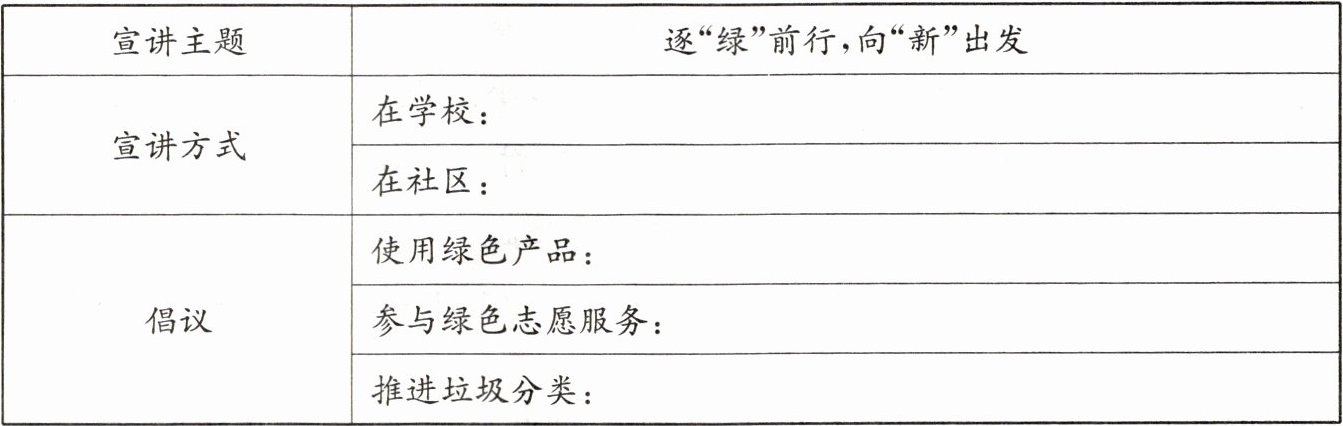 (2)示例:在学校:主题班会、黑板报等;在社区:主题展览、主题讲座等;使用绿色产品:选择环保材料制成的产品,减少环境污染;参与绿色志愿服务:积极参与保护环境的活动,提高公众的环保意识;推进垃圾分类:积极宣传垃圾分类知识,劝说别人不乱丢垃圾。