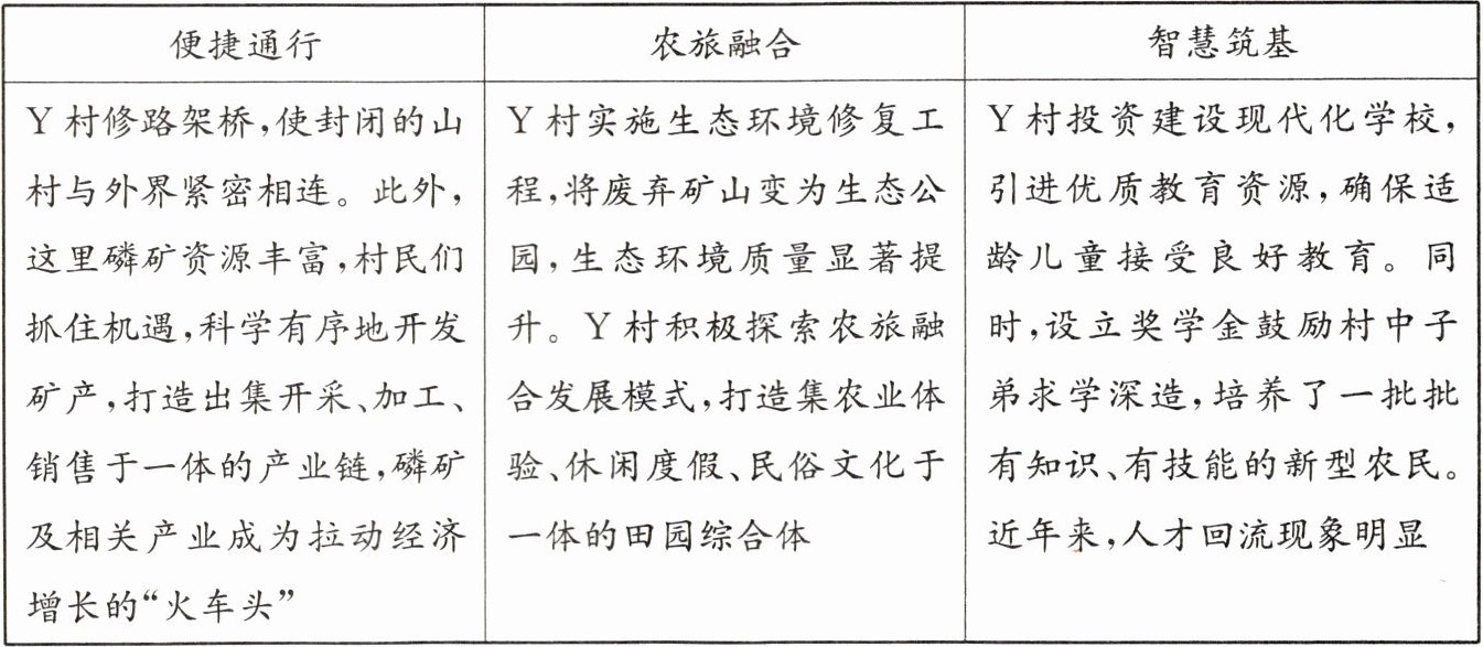 |Y 村修路架桥,使封闭的山村与外界紧密相连。此外,这里磷矿资源丰富,村民们抓住机遇,科学有序地开发矿产,打造出集开采、加工、销售于一体的产业链,磷矿及相关产业成为拉动经济增长的“火车头”|Y 村实施生态环境修复工程,将废弃矿山变为生态公园,生态环境质量显著提升。Y 村积极探索农旅融合发展模式,打造集农业体验、休闲度假、民俗文化于一体的田园综合体|Y 村投资建设现代化学校,引进优质教育资源,确保适龄儿童接受良好教育。同时,设立奖学金鼓励村中子弟求学深造,培养了一批批有知识、有技能的新型农民。近年来,人才回流现象明显|