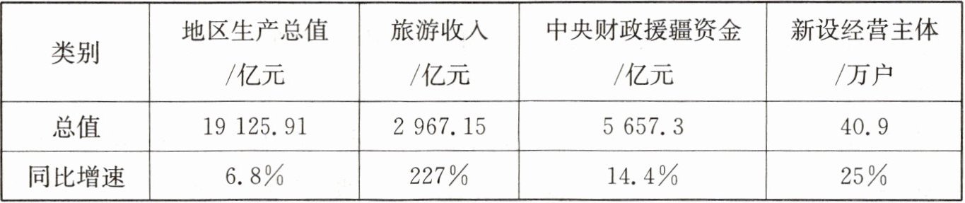|类别|地区生产总值/亿元|旅游收入/亿元|中央财政援疆资金/亿元|新设经营主体/万户|