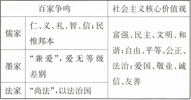 B(解析:由表中内容可知,当今的社会主义核心价值观的内容植根于墨家、儒家和法家学说,这表明诸子百家的思想对后世影响深远。)